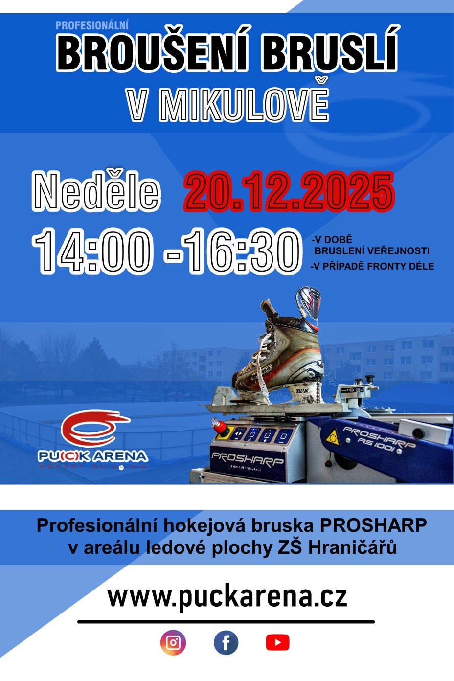 v neděli, 20.12.2025, budeme v areálu ZŠ Hraničářů brousit brusle. Samotné broušení bude probíhat od 14:00 do 16:30.